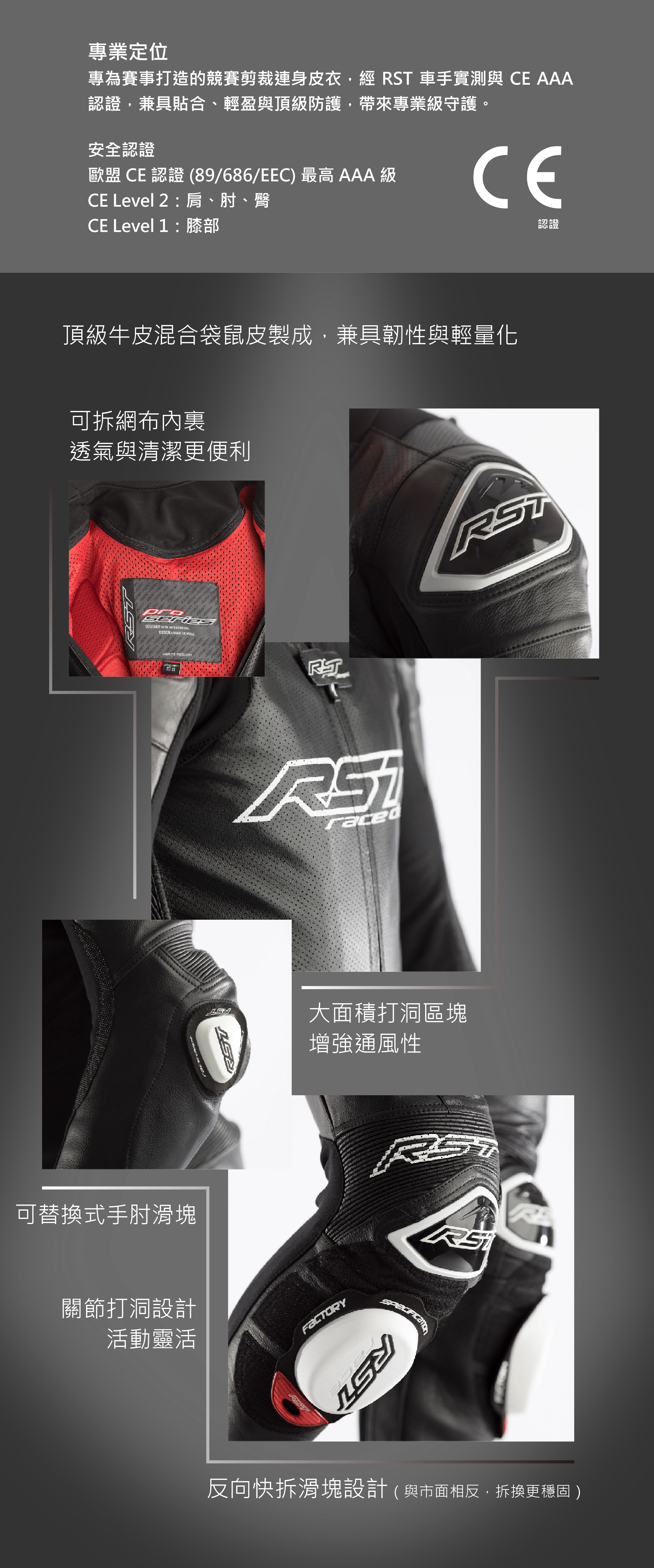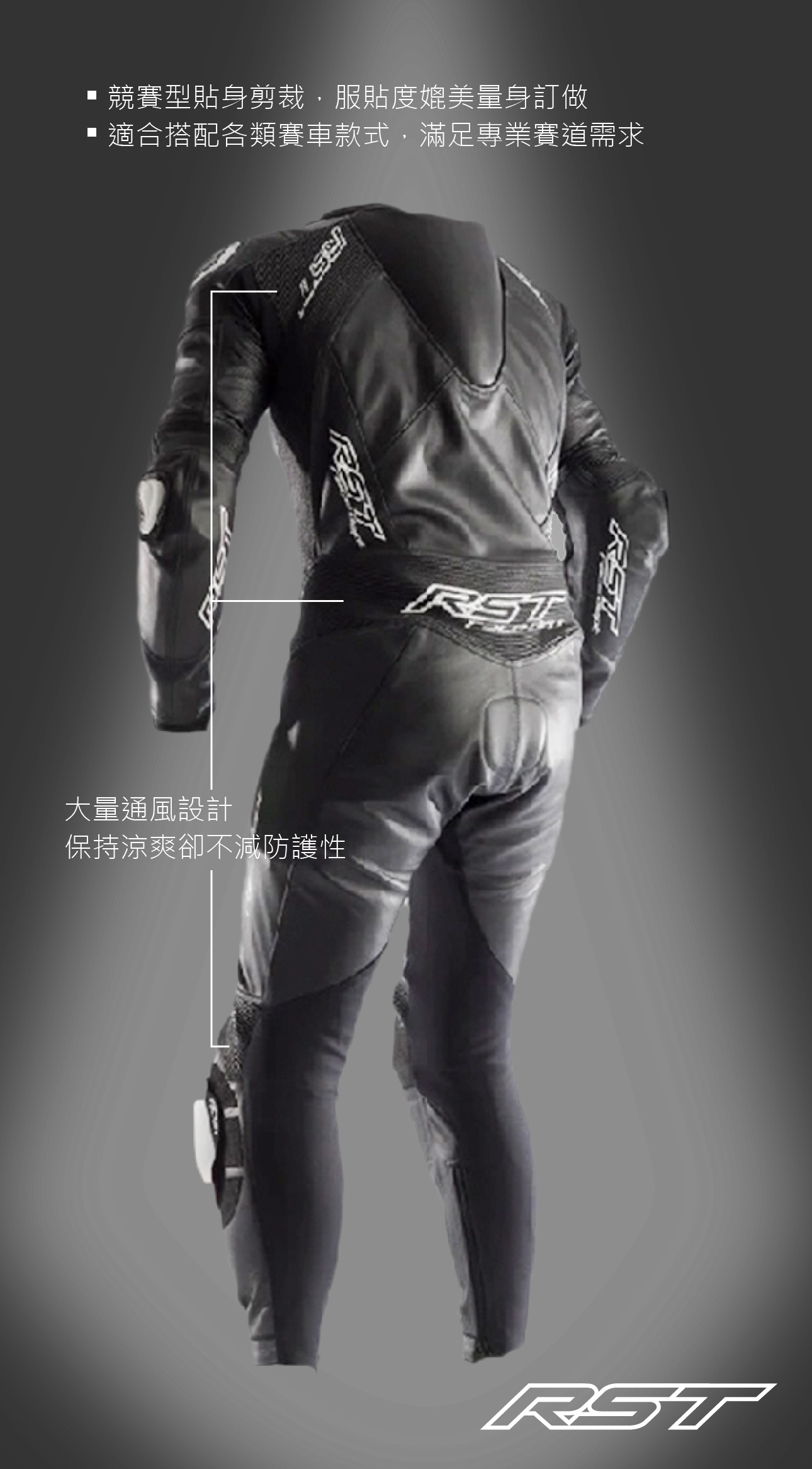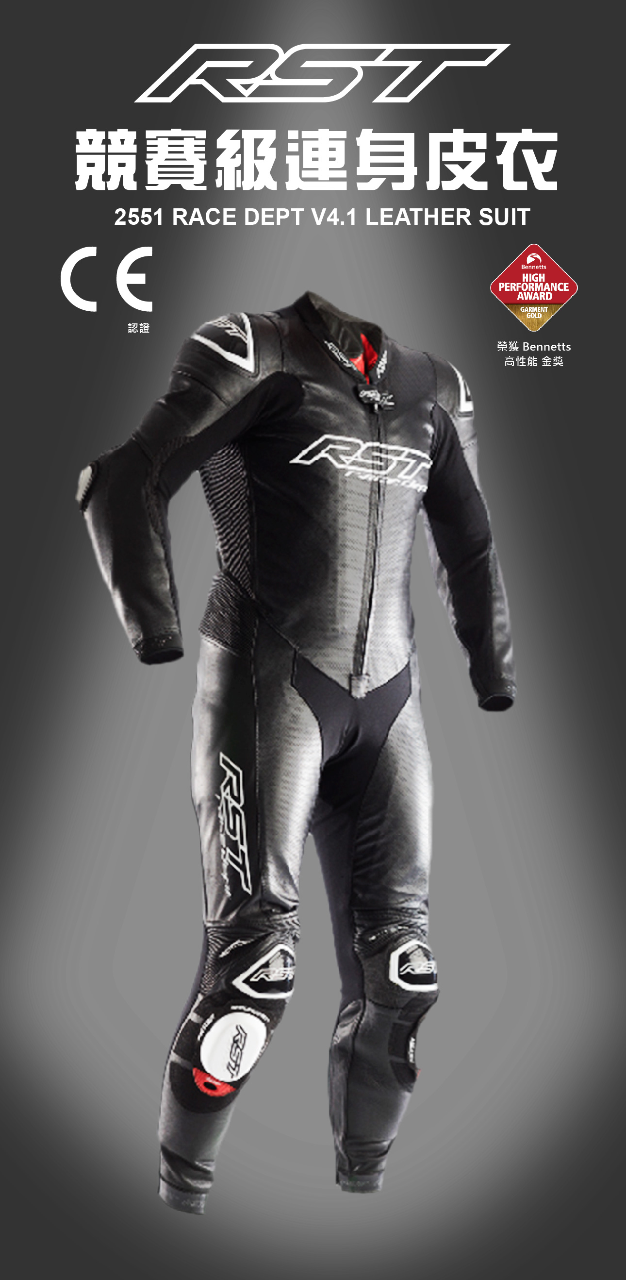 RST V4.1 Race Suit是一款競賽貼身剪裁連身皮衣,有著最完美的的合身性,適合穿著它騎乘所有比賽車款。正如RST贊助選手所穿的那樣,已經由選手本身試用以及測試過它的防護性了。V4.1連身皮衣通過AAA級別的CE級認證,具有LEVEL 2的肩、肘、臀和LEVEL 1膝部護具,而它的特性在於大面積的使用打洞袋鼠皮製成,整體來說,不僅比其它款的連身皮衣更輕盈,而且增加大量通風卻不影響防護的品質,想體驗如選手般的服貼感,歡迎來試試。