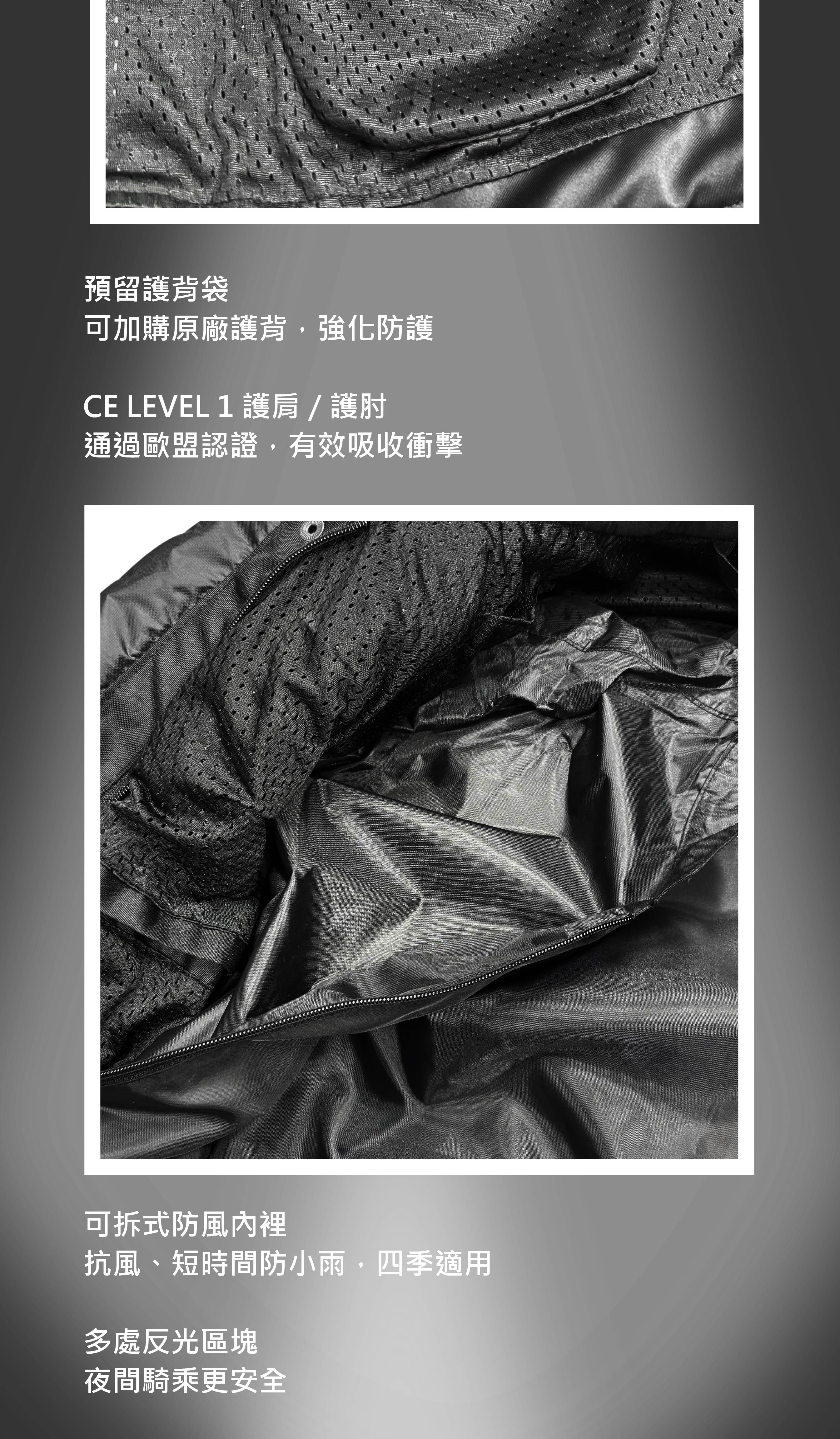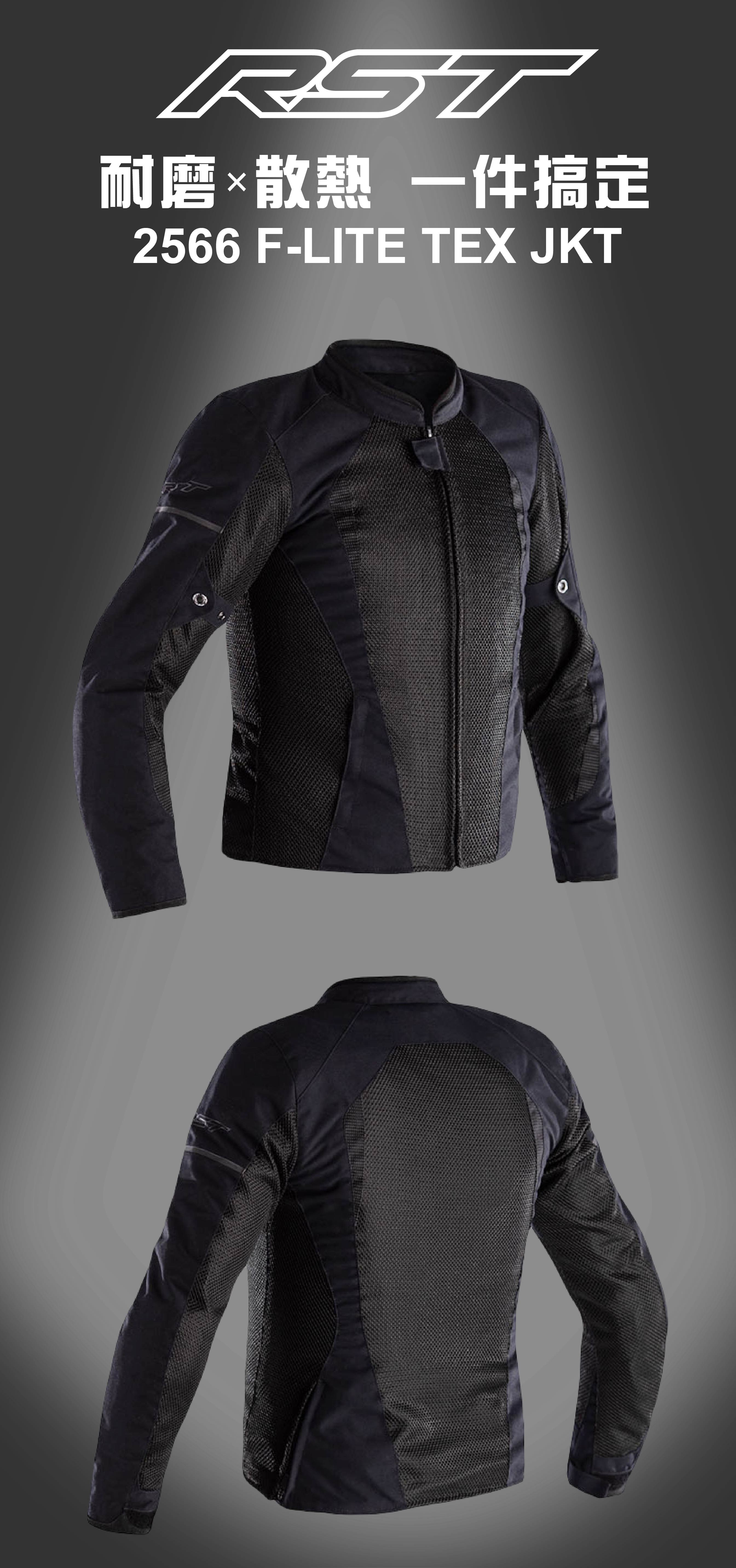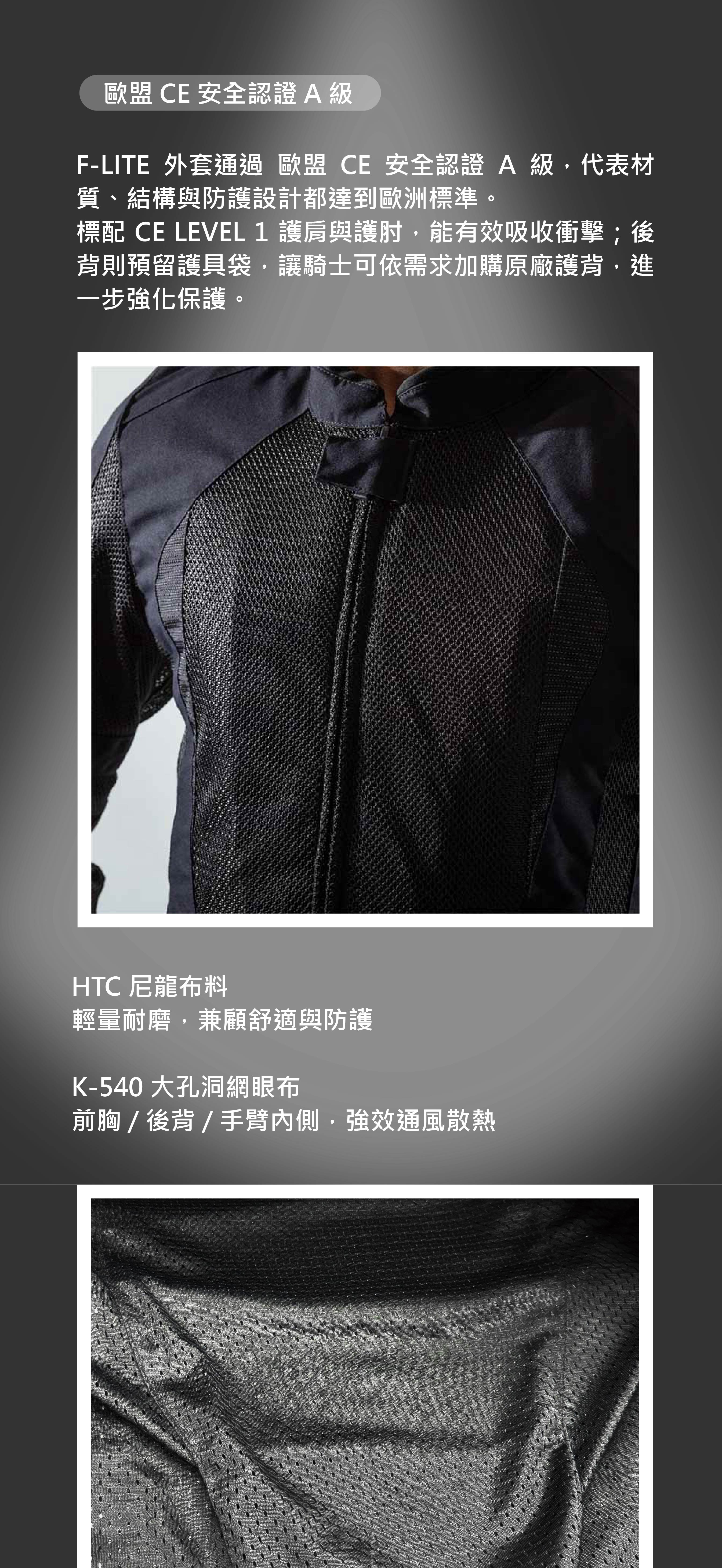 F-LITE使用K-540網眼布加上舒適的HTC尼龍布料組成,在提供抗磨擦的同時又能提供最大的進風及散熱。可拆式防風內裡,除可因應瞬間的冷熱氣候變化外,同時也帶有短時間抵抗小雨的作用。可與我們的摩托車用牛仔褲做簡易的出遊搭配,舒適有型。