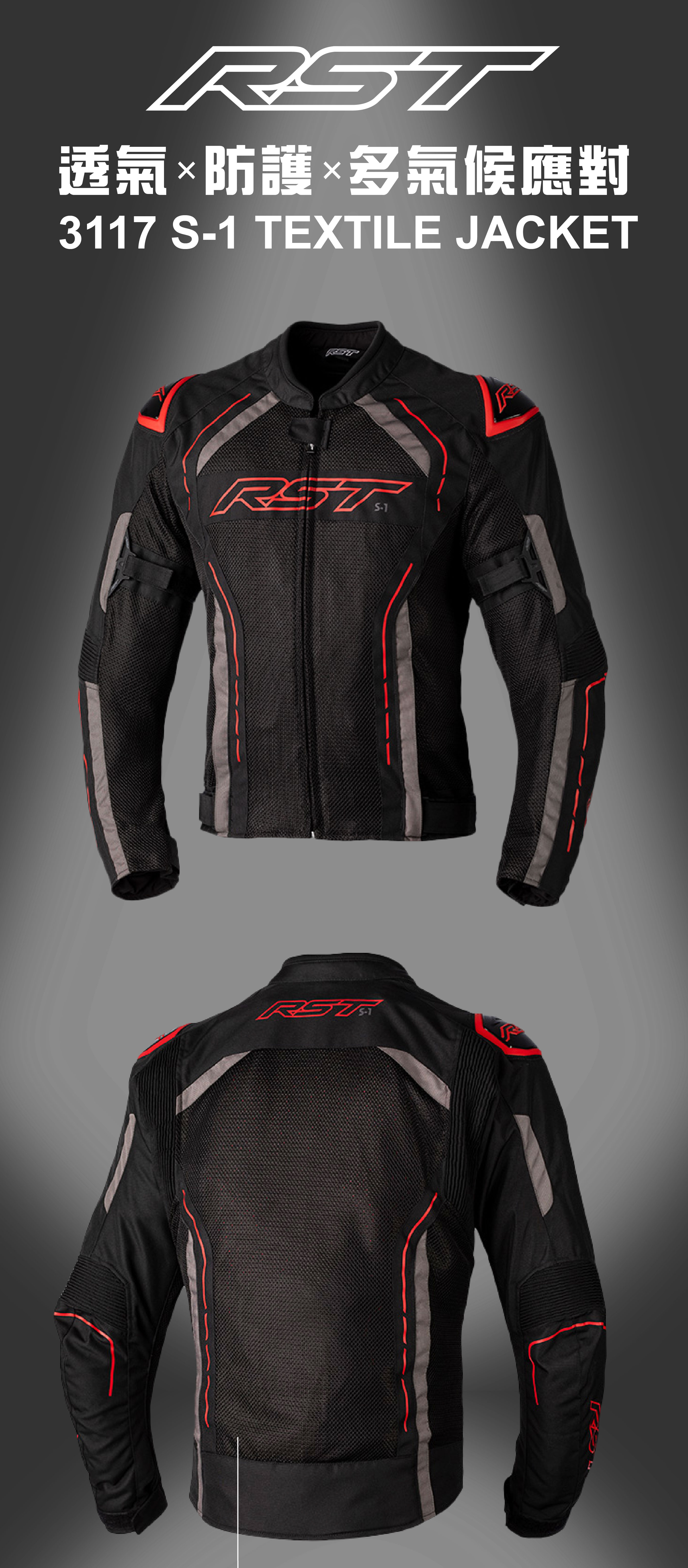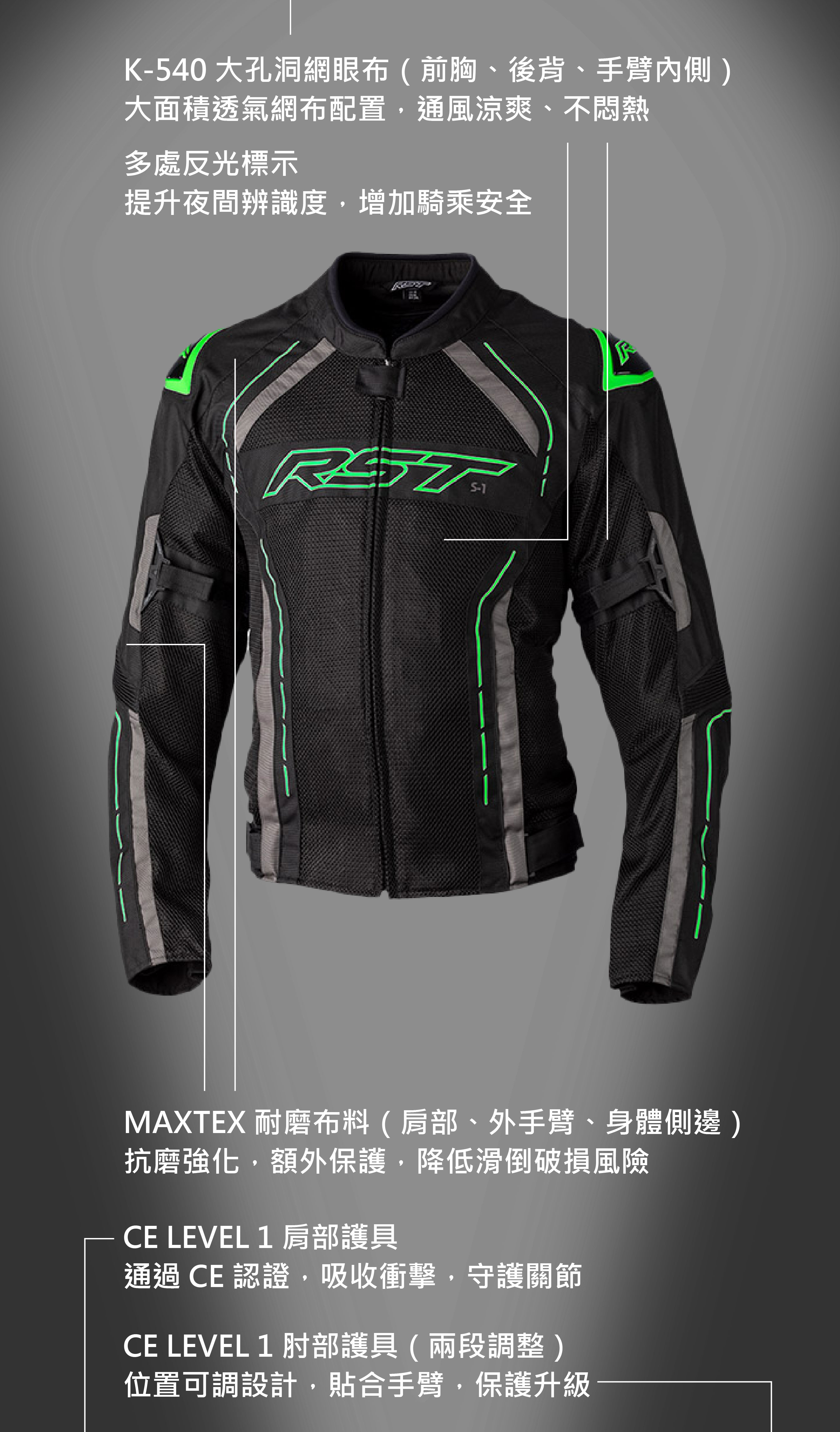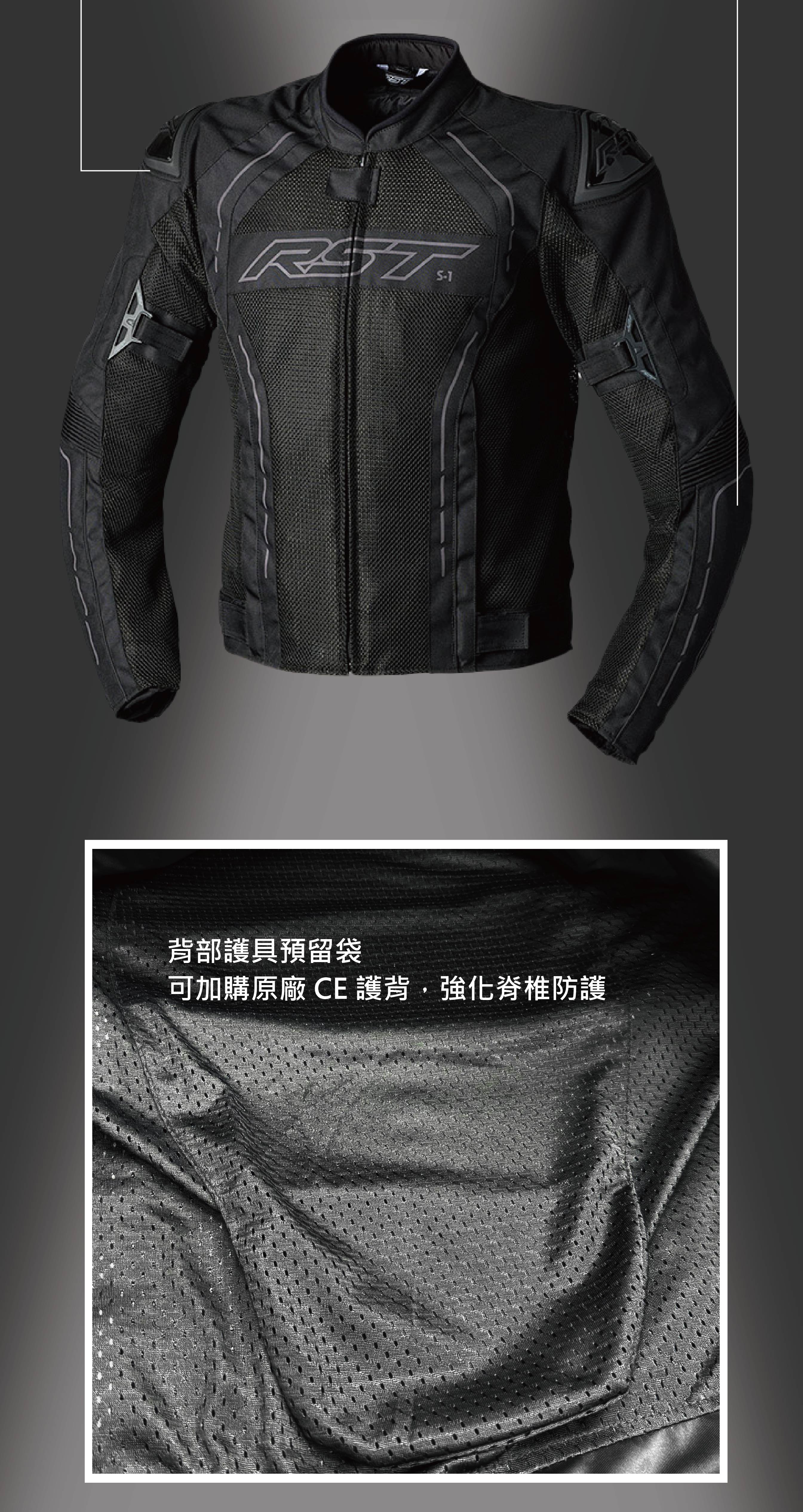 S-1使用K-540網眼布加上耐磨的MAXTEX布料組成,在提供抗磨擦的同時又能有最大的進風量及散熱度。可拆式SINAQUA防水內裡,兼具防水和防風功能,除可因應瞬間的冷熱氣候變化外,只要不是寒流過境,以S-1加上SINAQUA內裡,皆可應付絕大多數的氣候。可與我們的摩托車用牛仔褲做簡易的出遊搭配,舒適有型。