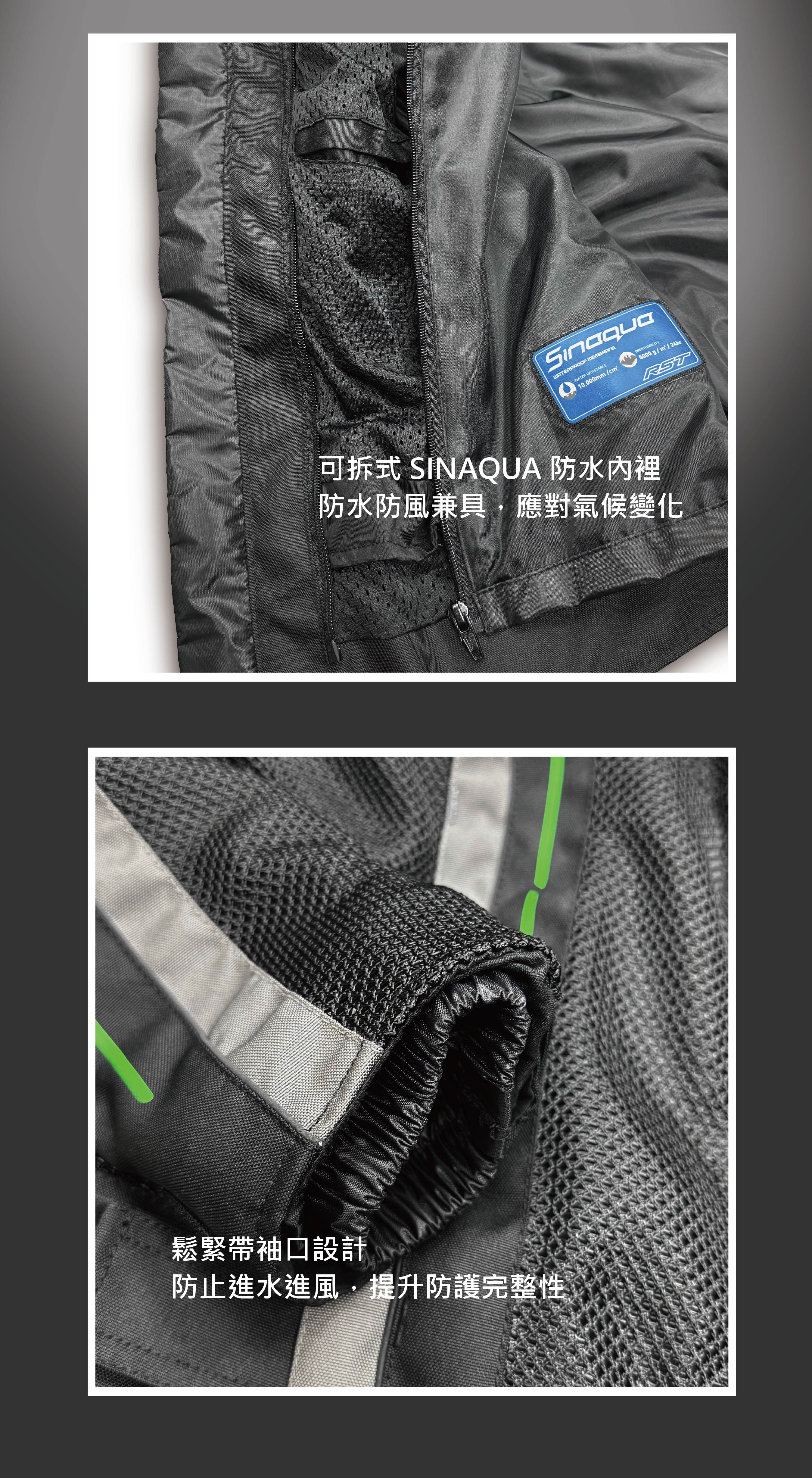 - 改良式SINAQUA可拆防水、防風內裡。鬆緊帶袖口,可有效降低進水、進風的可能性