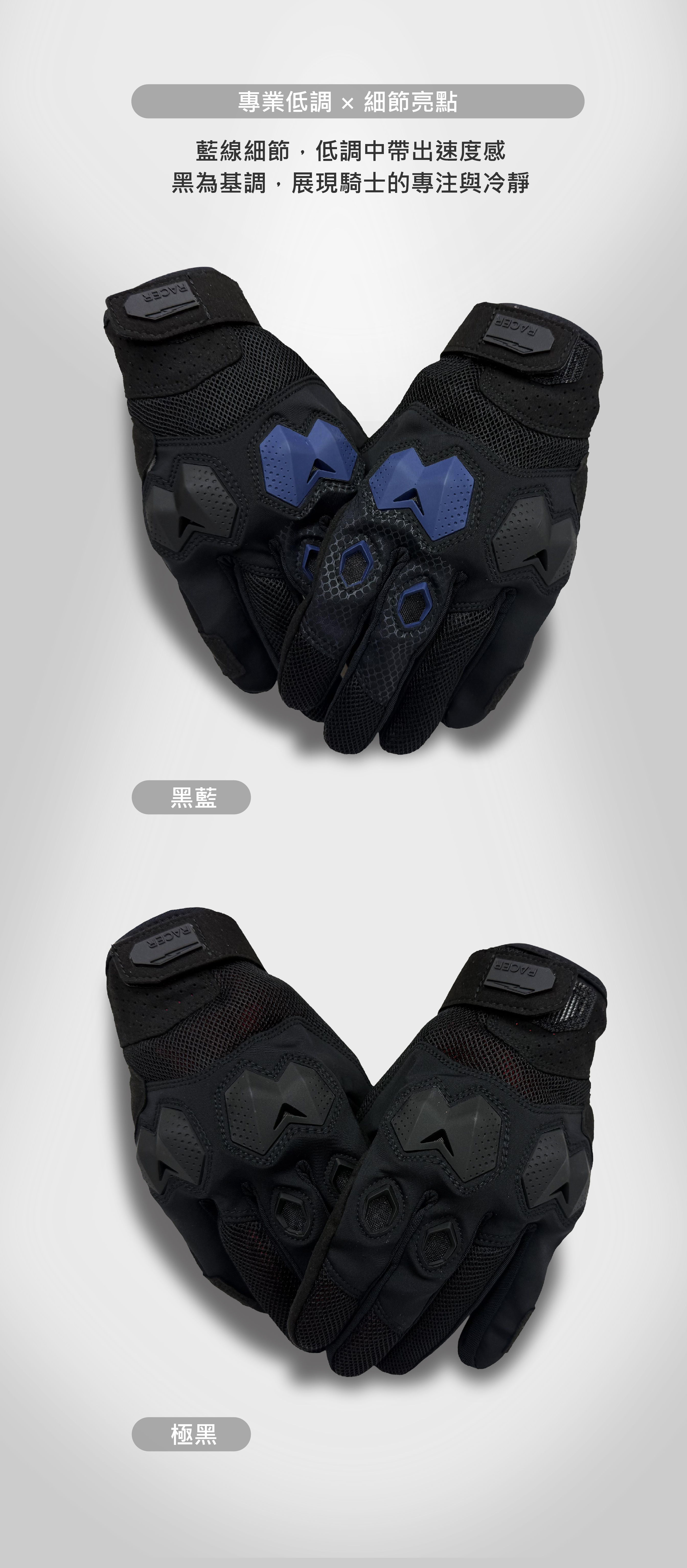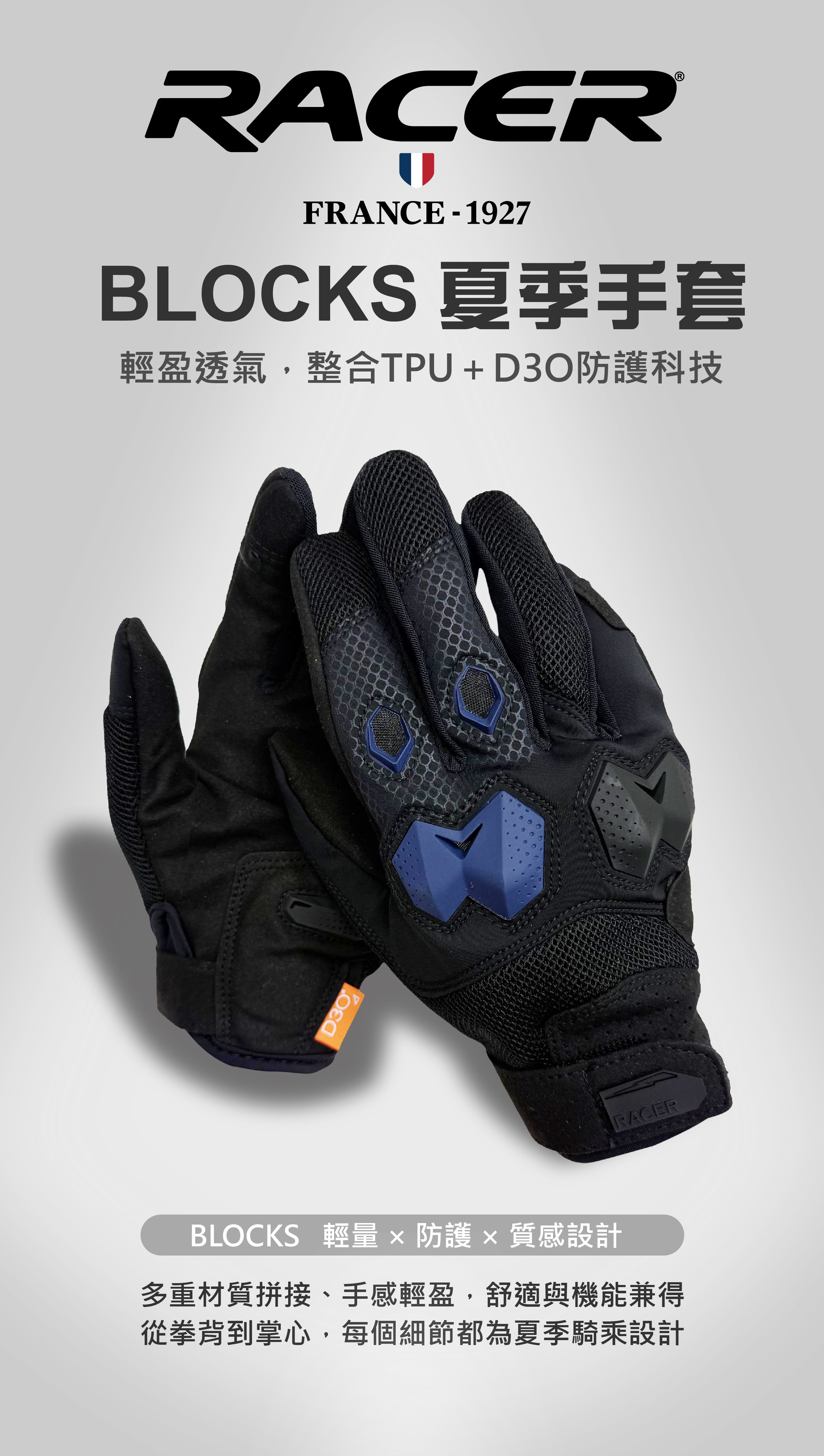 "BLOCKS" 夏季手套如同RACER的一貫風格,以低調中帶質感為主,採用三種不同布料組成加上CLARINO人皮革及TPU和D3O護具,極輕量化但又不失其保護性。配色上雖仍以黑色為主軸,但添加其中的藍或紅色,也展現出RACER在設計上的巧思。想要允文允武的夏季手套? 相信BLOCKS可以滿足你的需求。